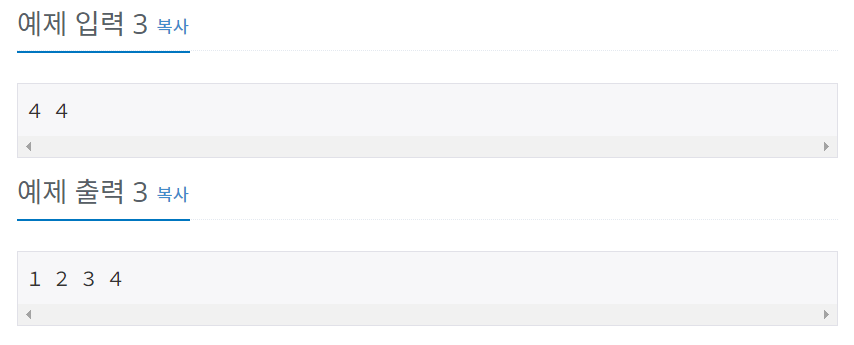 package Q15650; import java.util.ArrayList; import java.util.Collections; import java.util.HashSet; import java.util.Iterator; import java.util.Scanner; import java.util.Random; public class Main { public static void main(String[] args) { Scanner scan = new Scanner(System.in); int x = scan.nextInt(); int y = scan.nextInt(); // 조합 이용 Random rand = new Random(); HashSet<String> set = pick(rand, x, y); ArrayList<String> al = new ArrayList<>(set); Collections.sort(al); // HashSet을 ArrayList로 변환해서 정렬 for(int i = 0; i < al.size(); i++) { System.out.println(al.get(i)); } } public static HashSet<String> pick(Random rand, int x, int y) { int fac = fac(x)/(fac(y)*fac(x-y)); // 뽑을 수 조합 경우의 수 HashSet<String> set = new HashSet<String>(); while(set.size() < fac) { // set을 이용하여 숫자 조합 중복 방지 HashSet<Integer> newSet = new HashSet<Integer>(); while(newSet.size() < y) { // set을 이용하여 숫자 중복 방지 int rnd = rand.nextInt(x) + 1; // 1 ~ x까지 난수 newSet.add(rnd); } Iterator it = newSet.iterator(); String str = ""; while(it.hasNext()) { str += it.next() + " "; } set.add(str); } return set; } public static int fac(int num) { if(num > 0) { return num * fac(num-1); }else { return 1; } } }