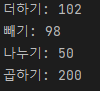System.out.println("더하기: " + big.add(big2)); System.out.println("빼기: " + big.subtract(big2)); System.out.println("나누기: " + big.divide(big2)); System.out.println("곱하기: " + big.multiply(big2));
