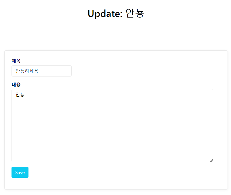 extends base.pug block content form(method="post") label(for="") 제목 input(name="title", placeholder="Title", value=table.title, required) label(for="") 내용 textarea(name="content", cols="30", rows="10", placeholder="Content", required)=table.content input(value="Save", type="submit", style="color:white").btn.btn-infoboard.css