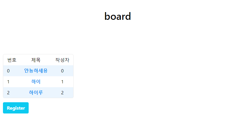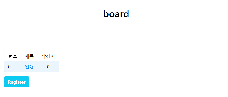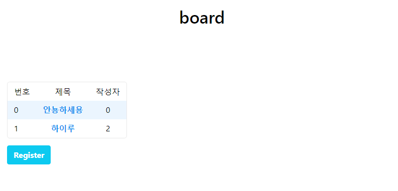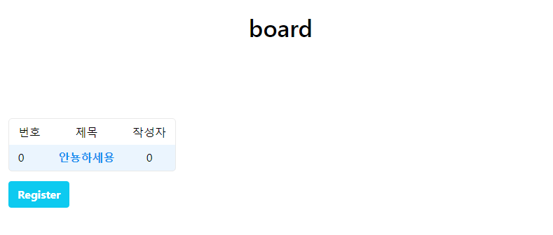 게시글 추가 후 게시판 페이지(login 페이지를 아직 구현하지 않아서 작성자는 게시글 id로 표시되도록 함)