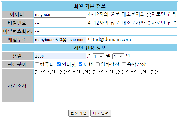 <td><input name="id" type="text" minlength="4" maxlength="12"> 4~12자의 영문 대소문자와 숫자로만 입력</td>